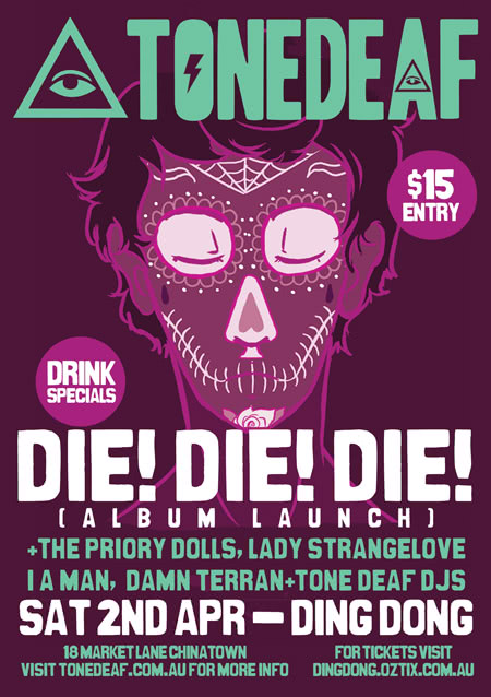 Masterfully produced and recorded by Nick Roughan (The Skeptics), FORM is Die! Die! Die! like you have never heard. Is it noise pop? Post punk? Shoe gaze? Noise/ post/ gaze/pop? We’re not sure but we know what makes a Tone Deaf party rock and joining them for the night will be Adelaide’s Lady Strangelove, The Priory Dolls, I A Man and Damn Terran for what will be the biggest Tone Deaf party we’ve ever thrown! Throw in Ding Dong’s $10 jugs of beer before 10 and the Tone Deaf DJ crew busting out indie, rock and garage anthems until the wee hours and this is going to be one party you CAN’T miss. Get your pre-sale tickets from www.dingdonglounge.oztix.com.au or risk it on the door.