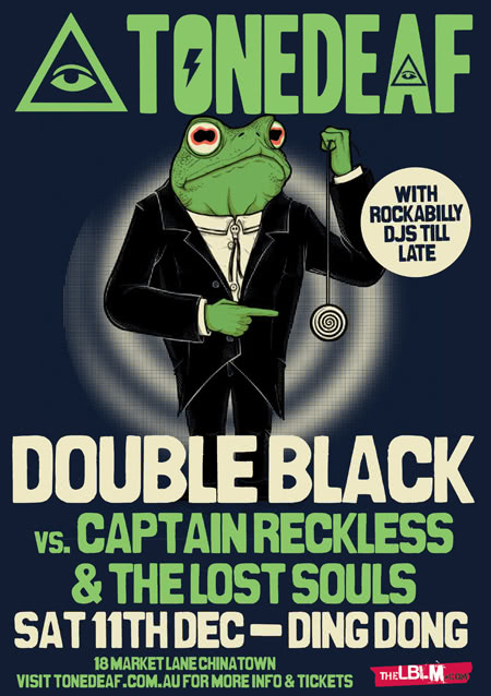 It’s a rockabilly vs psychobilly rumble at Ding Dong this Saturday 11th December as Tone Deaf presents an onstage showdown between the legendary Double Black in one corner and Captain Reckless and The Lost Souls in the other in a musical duel in which we, the punters will, be the biggest winner. Double Black are dragging their three piece psychobilly swindle up the Ding Dong stairs and invite all the cats and dolls to twirl up a sweat on the dance floor, while Captain Reckless & The Lost Souls are arriving in a shimmering haze of hairspray and wax to give you a night of skee shaking foot stomping rockabilly. With special guest opening and Melbourne’s finest rockabilly and psychobilly DJs hitting the decks until dawn, this is making a late charge for one of the parties of the year.