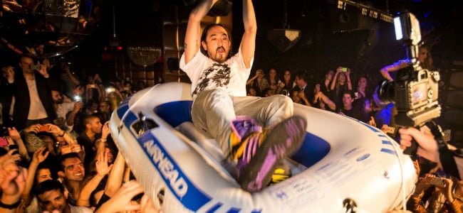 Yes, we’re talking about Steve Aoki. If you’re not familiar with Aoki, he’s the long-haired, goateed play-presser best known for riding over his audience in a rubber dinghy and throwing birthday cakes at them. He was also featured in a performance video alongside fellow DJs Sander van Doorn and Laidback Luke where the trio didn’t really do much of anything (see below).