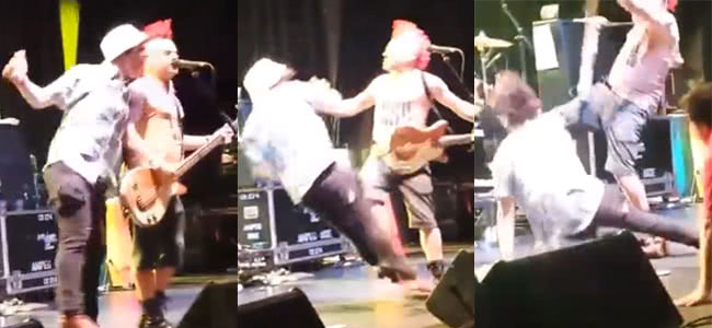 As readers can see in the footage below, an eager and admittedly “way too drunk” fan who rushed the stage to get some one-on-one time with Fat Mike during NOFX’s concert at Sydney’s Enmore Park last night sobered up quick after he was elbowed and kicked in the face by the irate frontman.