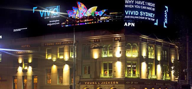 Sitting high above the CBD, on the roof of the Prince’s Bridge Hotel pub on the corner of Flinders and Swanson, Vivid organisers took over the electronic billboard that local residents know for regularly featuring upcoming attractions on Foxtel and Telstra ads to spruik the “Australian event of the year”.